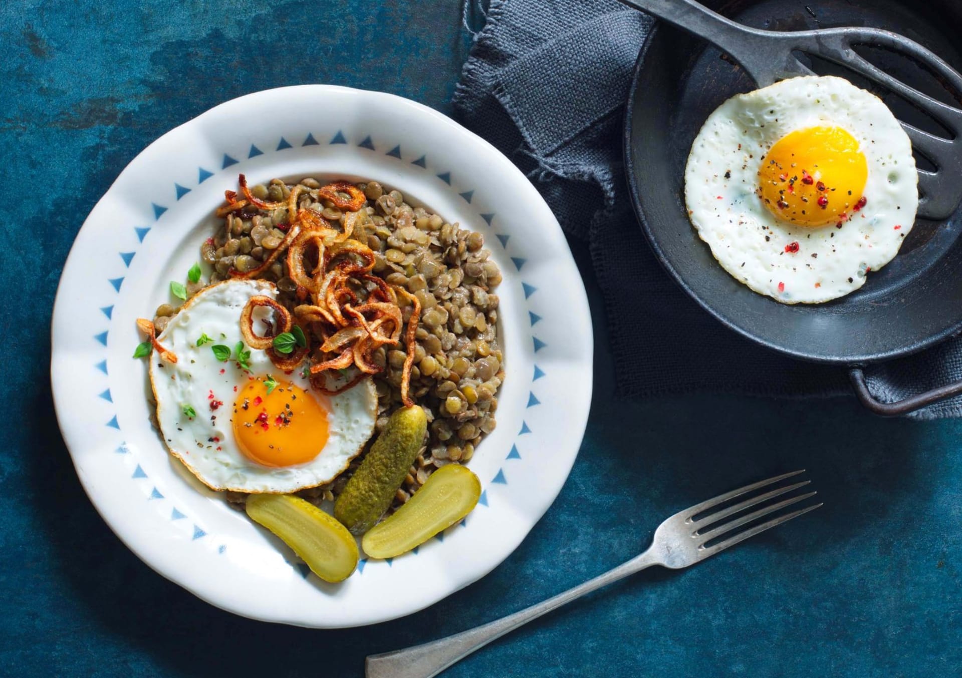 1. 300 g Novoroční čočka, sázené vejce, chléb